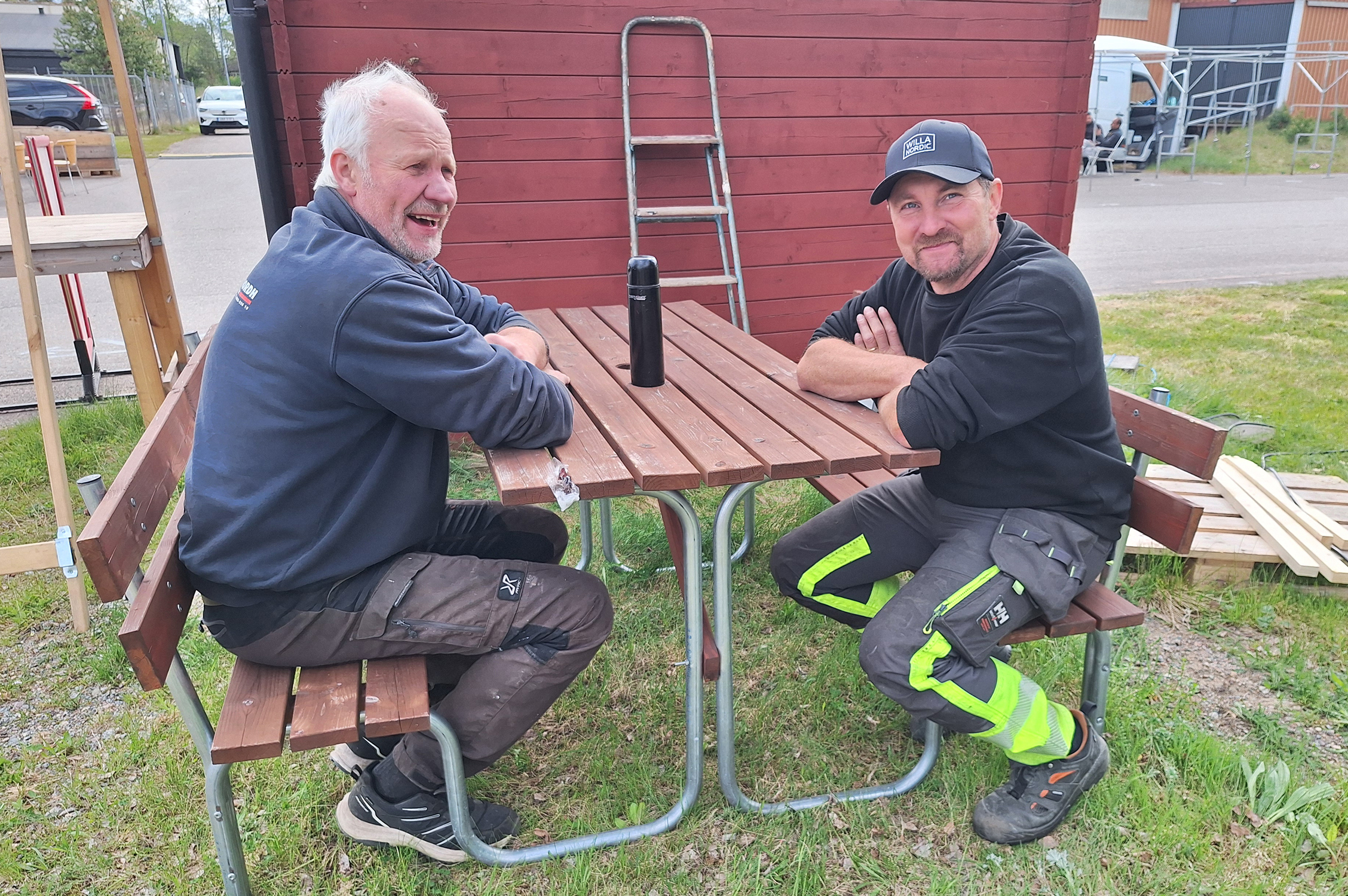 Niclas Claesson och Fredrik Bodefält tar en paus i arbetet med att göra klart inför marknaden.